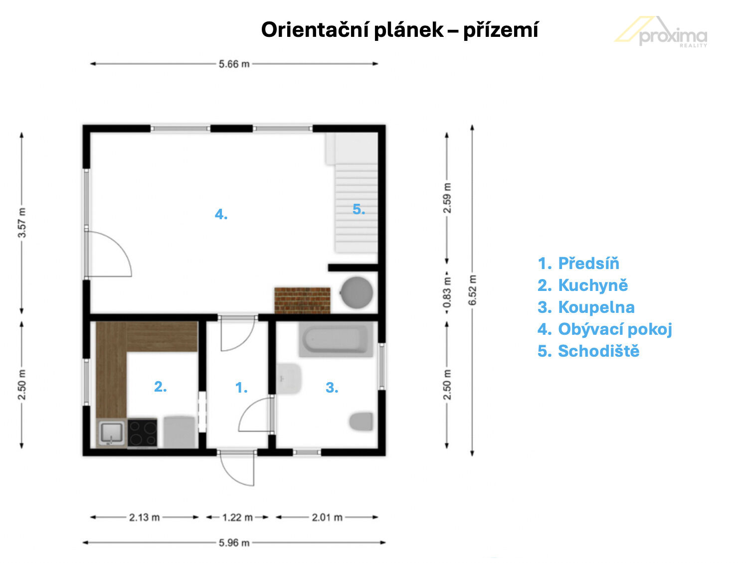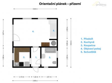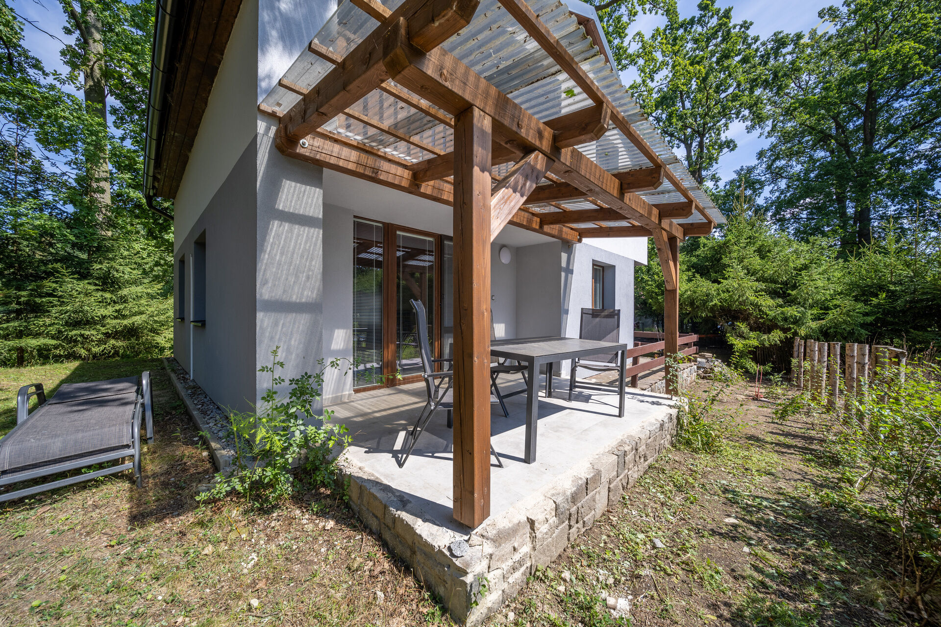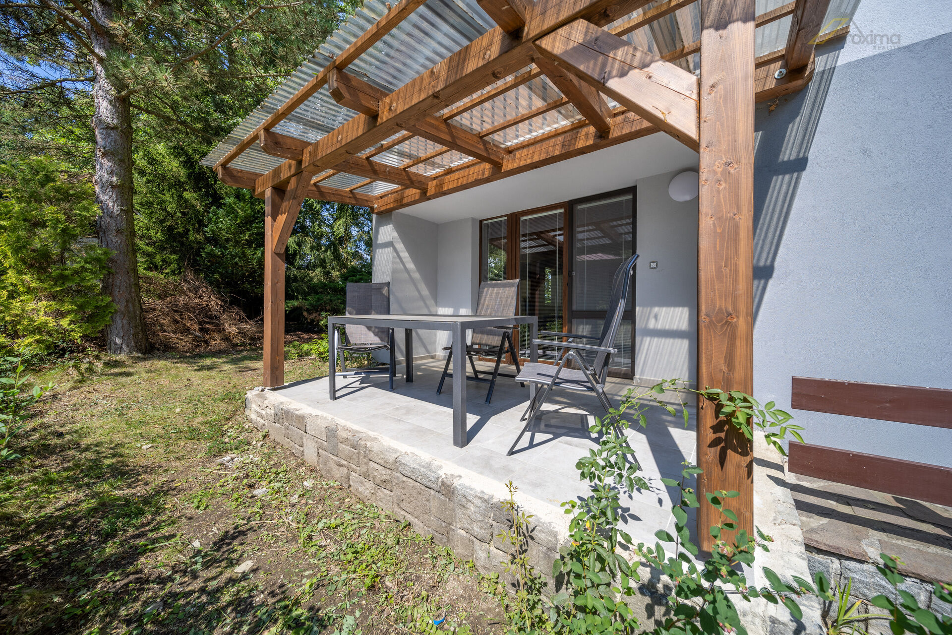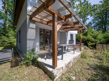 Přízemí: předsíň, kuchyně, koupelna s WC a prostorný obývací pokoj s krbem a přímým vstupem na krytou terasu.
