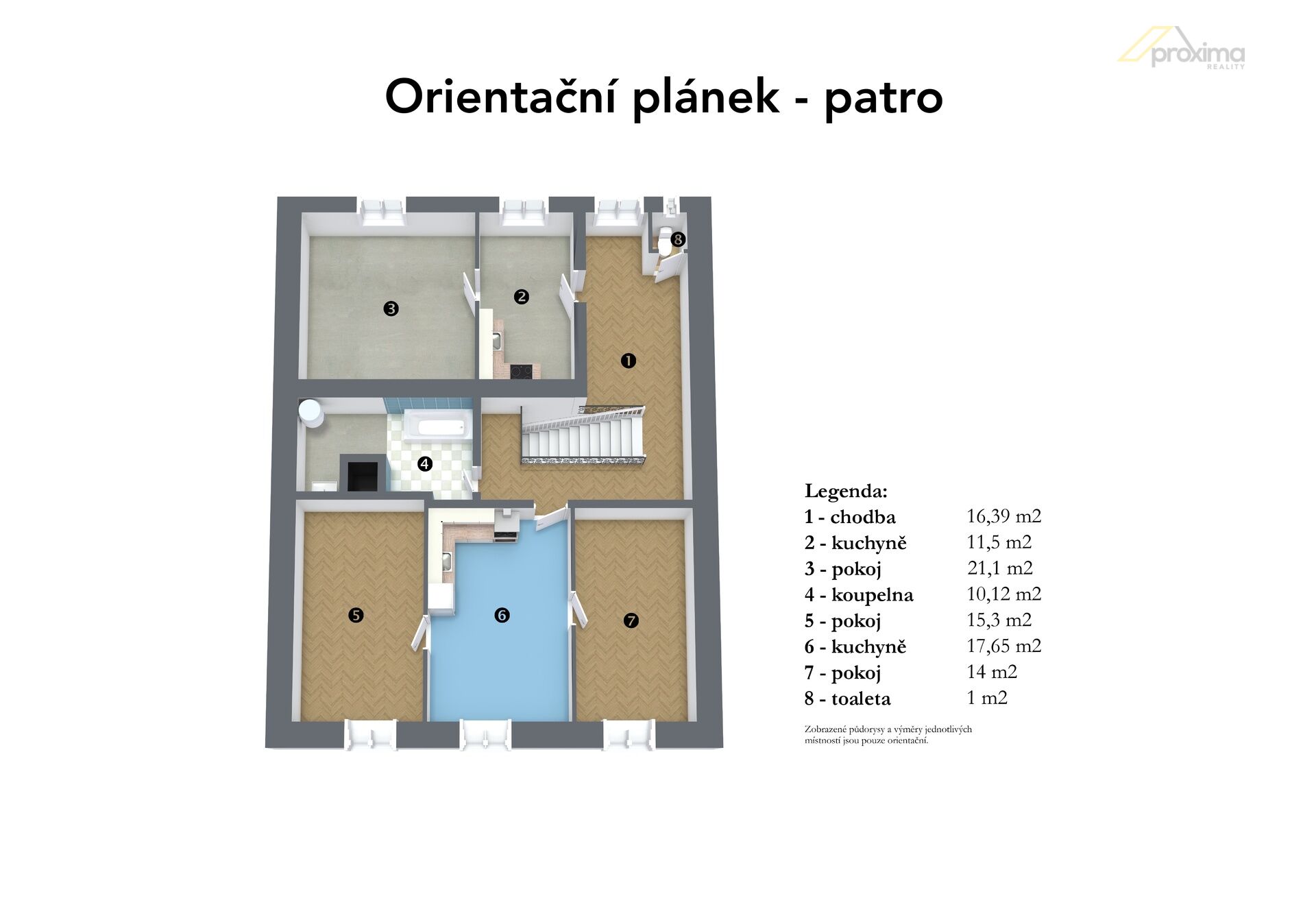 • V domě se nacházejí tři byty: byt v přízemí je o dispozici 2+kk. Byt v patře: jeden byt 1+1 a jeden byt 2+1. Horní byty mají v současnosti společnou koupelnu a WC, ale je zde možnost vybudovat pro každý byt vlastní zázemí.