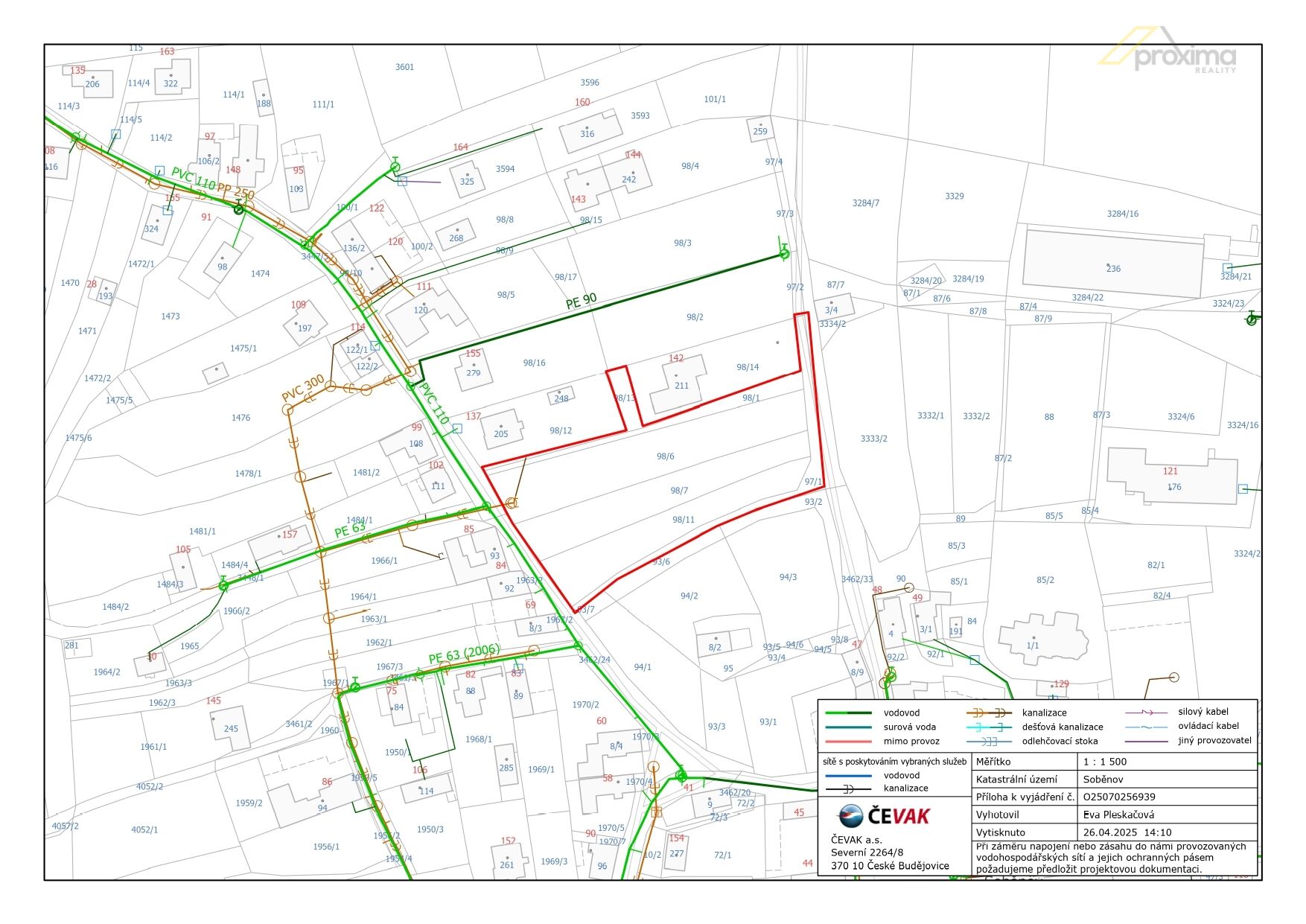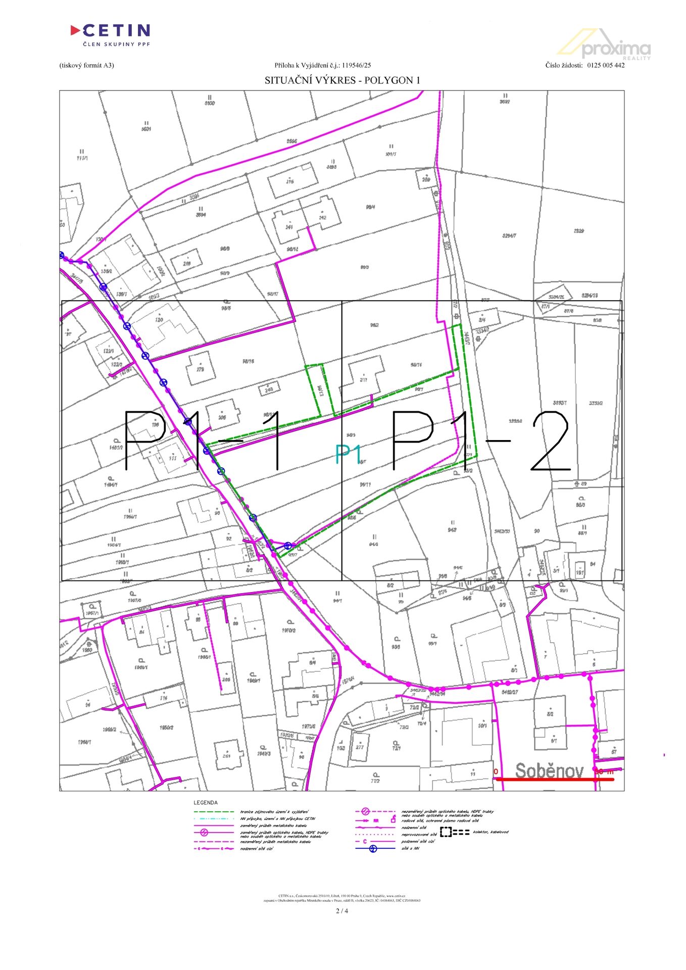 - Cetin: optický kabel vede po okrajích pozemků a je nutné zachovat ochranná pásma